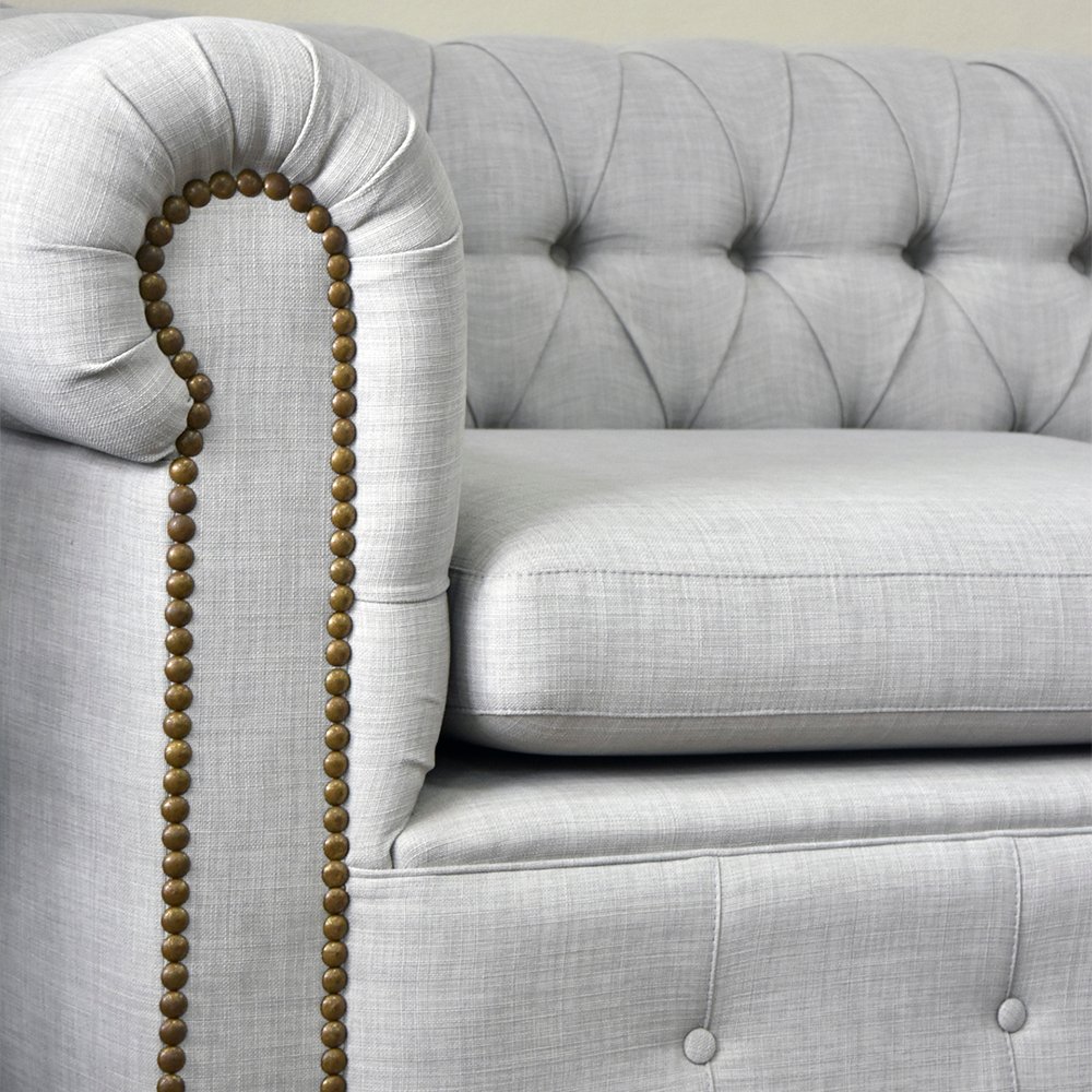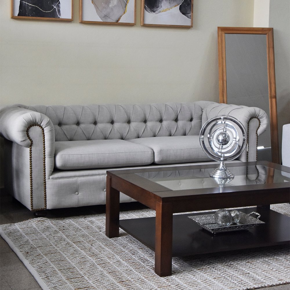 Sofá de estilo clásico, con respaldo y apoyabrazo con capitoné, que añade elegancia. El respaldo y los apoyabrazos son de la misma altura, lo que genera una silueta rectangular y majestuosa. El diseño de este sofá transmite sofisticación y tradición. Es una pieza que eleva inmediatamente el nivel de cualquier ambiente. Ideal para ser el protagonista de tu living, lobbie, sala de espera.