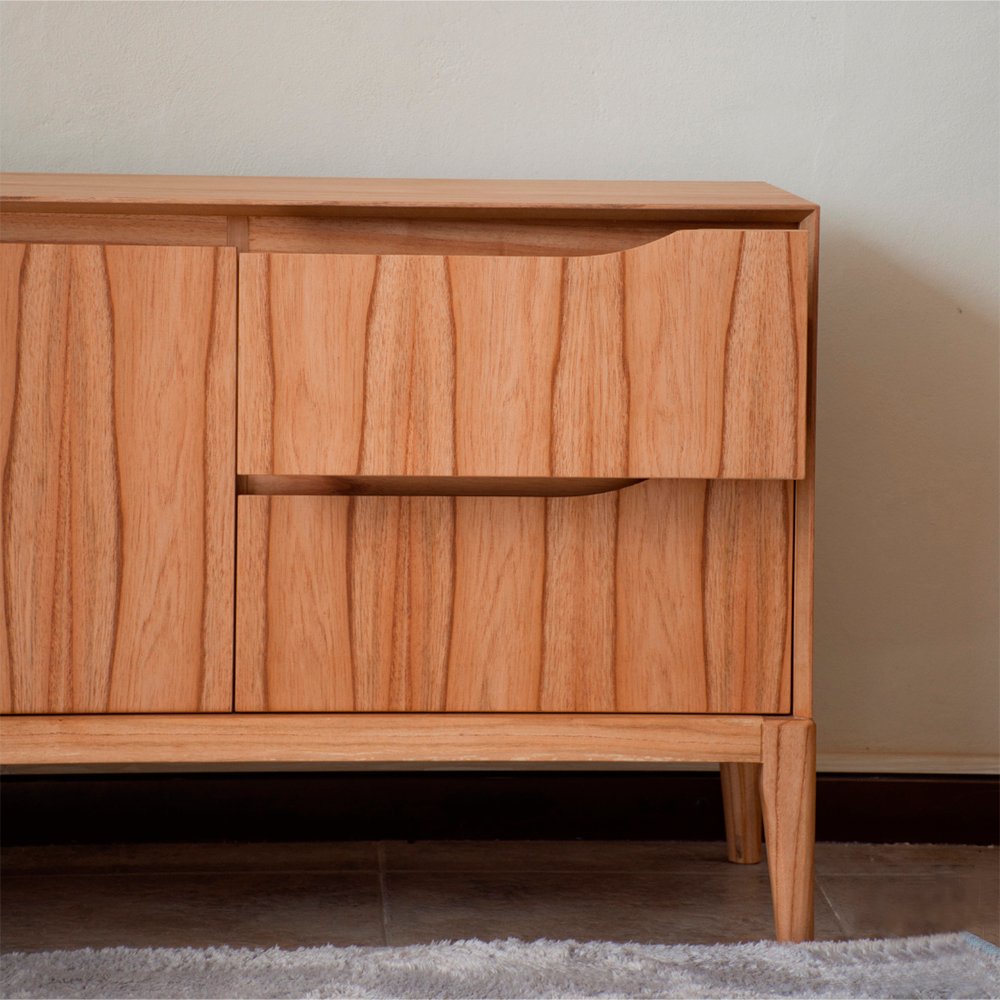 Mueble de diseño minimalista, cálido y funcional. De líneas limpias con tres cajones y dos puertas. Sus patas son de estilo moderno escandinavo. Es una pieza perfecta para ambientes contemporáneos o con un toque vintage. Ideal para living, comedor o espacios de guardado versátiles.