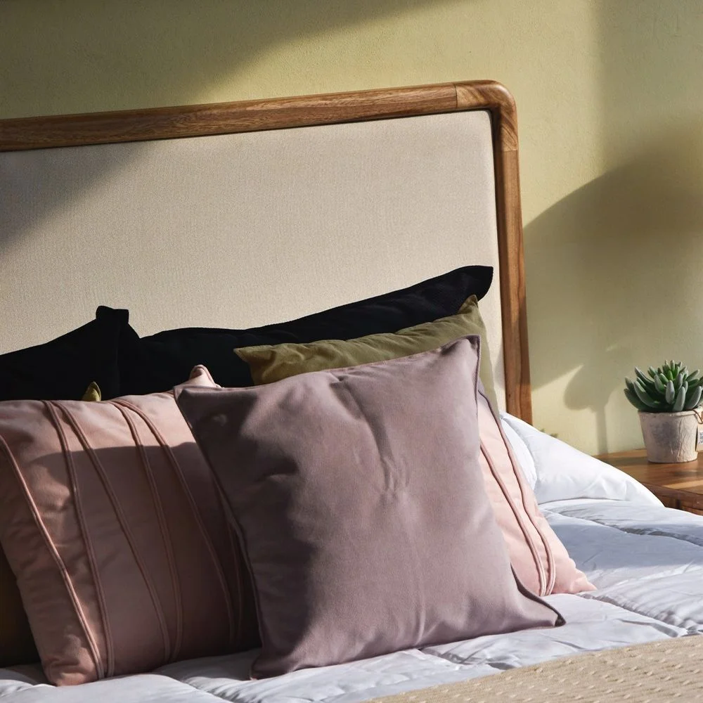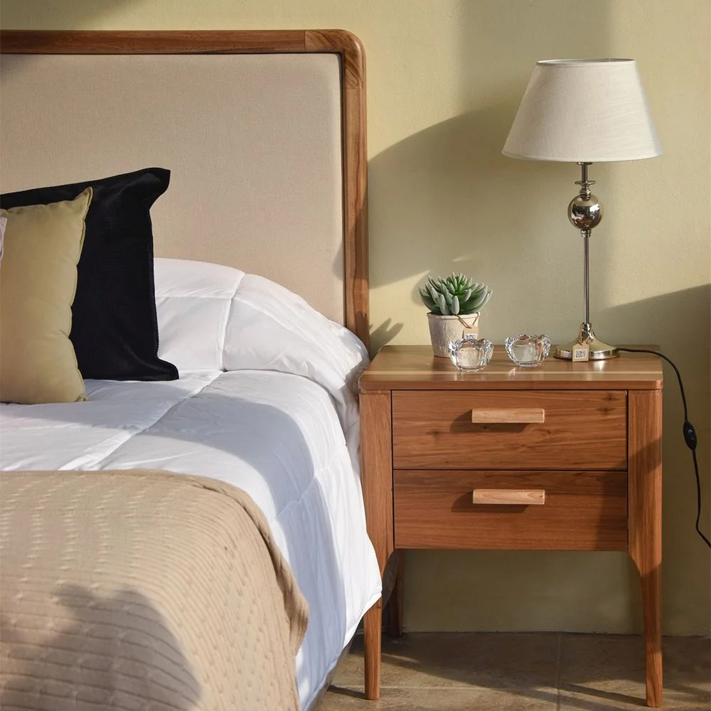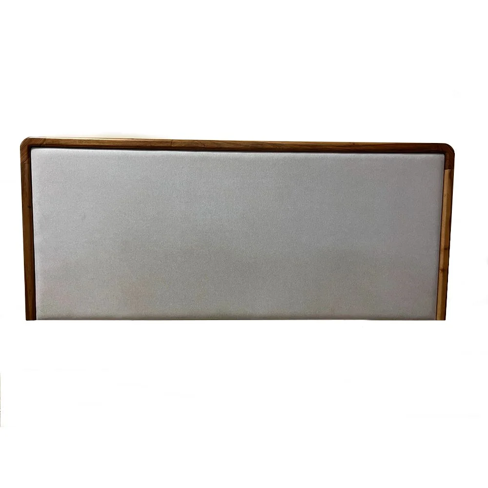 Respaldo de diseño moderno, de líneas limpias, con marco rectangular con sus esquinas curvas de madera y patas integradas, panel central tapizado lo que aporta textura, calidez y ligereza visual. Disponible en distintas maderas y terminaciones.