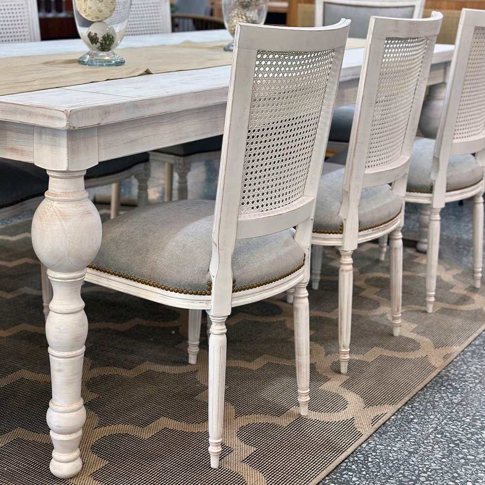 Silla de inspiración clásica y elegancia atemporal, perfecta para ambientes refinados, comedores distinguidos o espacios con estilo vintage o francés. El respaldo está compuesto por esterilla francesa natural, que aporta ligereza visual, frescura y un toque artesanal al diseño. El asiento está decorado con tachas que rematan el contorno, aportando un detalle sofisticado y decorativo. Las patas torneadas y talladas con motivos florales refuerzan su estética clásica, convirtiéndola en una pieza protagonista en cualquier ambiente elegante o romántico.
