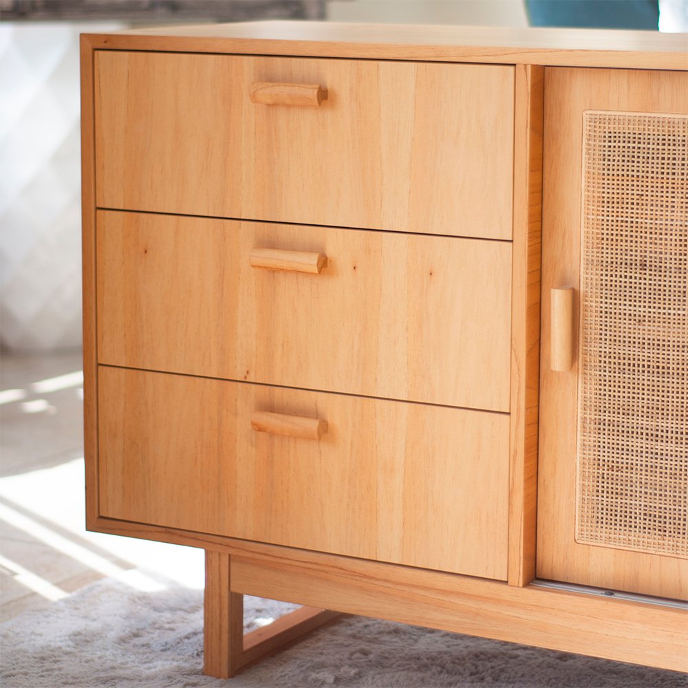 Mueble con diseño moderno y funcional. Cuenta con dos puertas y tres cajones con tiradores de madera integrados. Ideal como mueble de tv, vajillero, consola o mueble de almacenamiento.