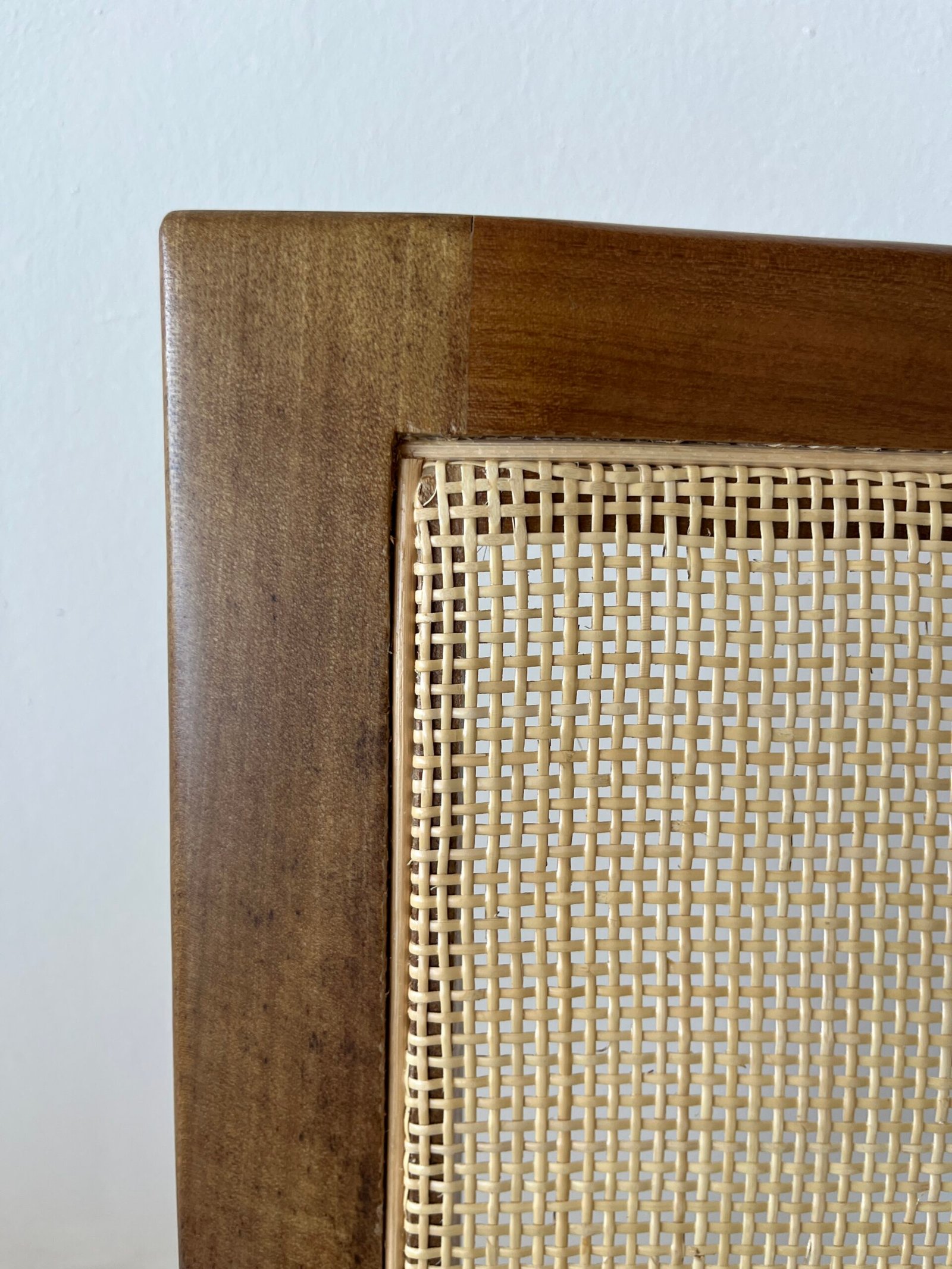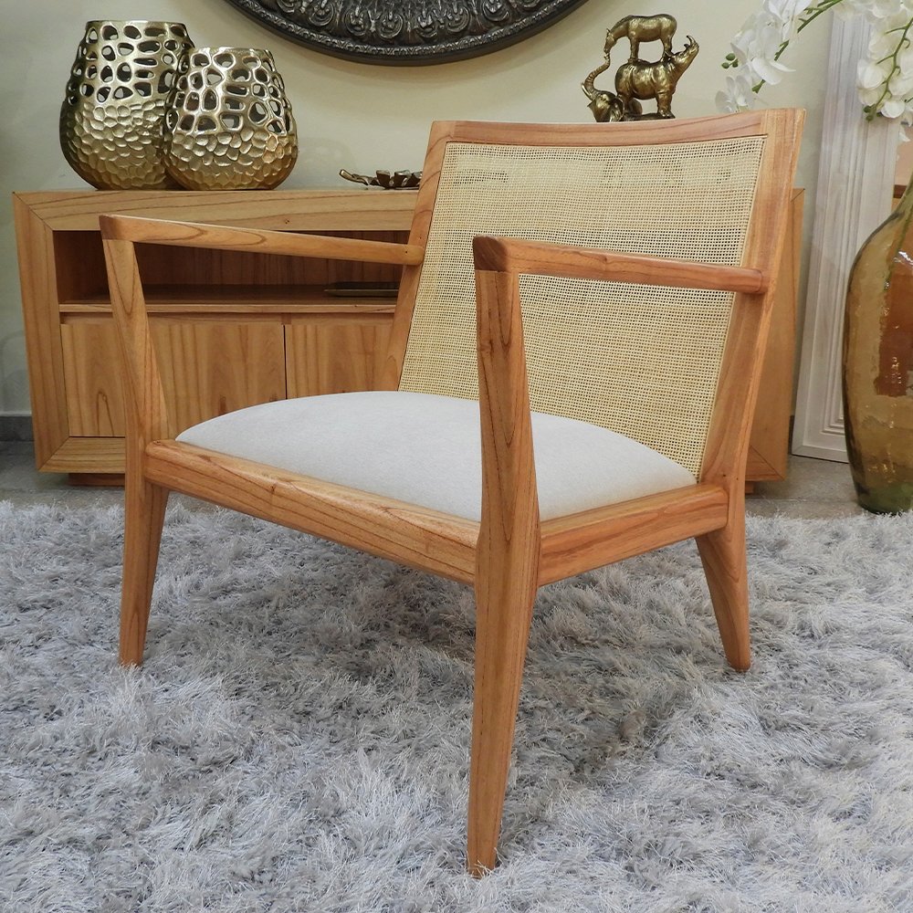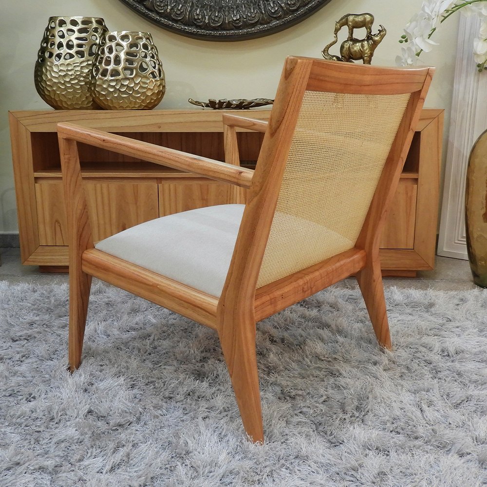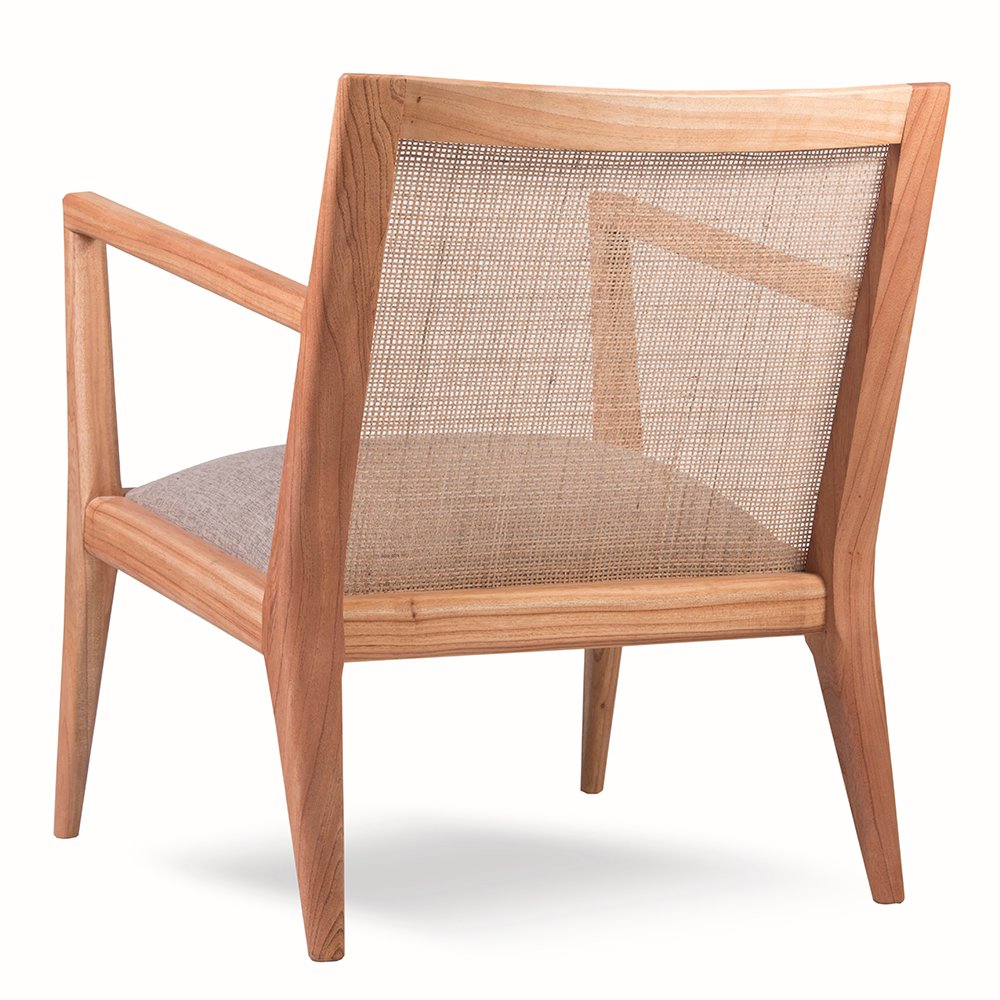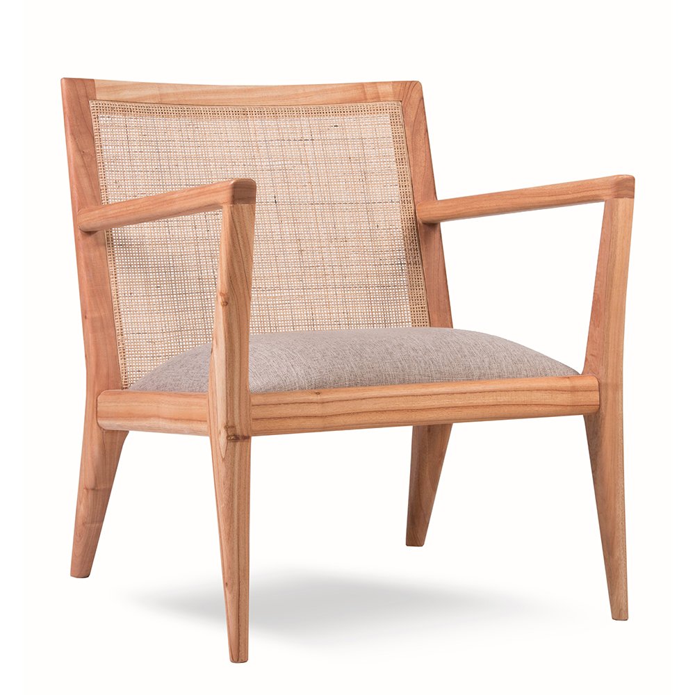 Sillón con líneas limpias y ángulos marcados. El diseño es recto pero con una leve inclinación en el respaldo y patas traseras lo que genera mayor confort y estabilidad. El respaldo de esterilla natural tejida le da un toque fresco, reduciendo el peso visual del sillón. Ideal para livings modernos, dormitorios amplios, salas de espera.