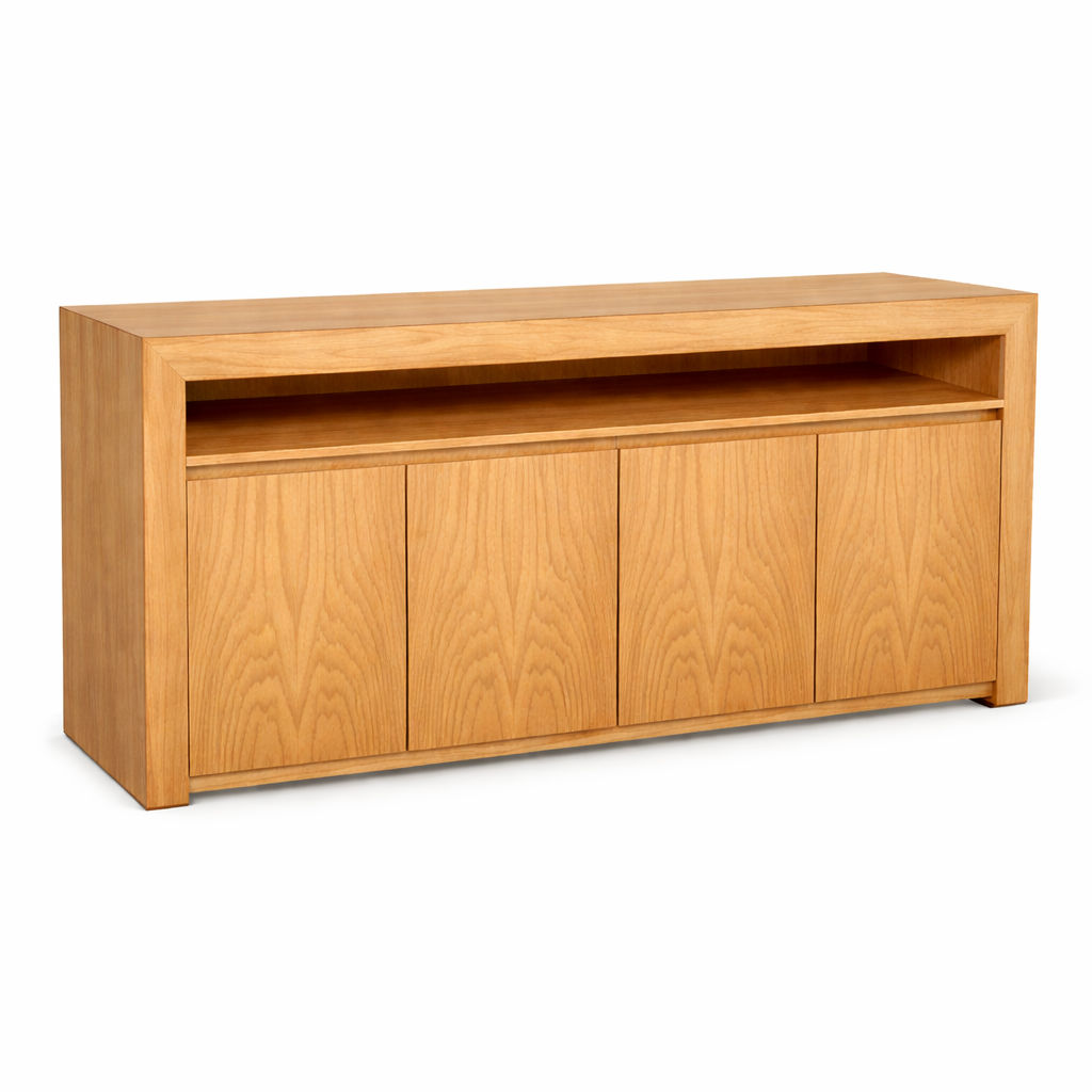 Mueble con una presencia fuerte y un diseño envolvente, combina sobriedad y funcionalidad en una sola pieza. El marco grueso enmarca una estructura elegante con un estante abierto superior y puertas lisas. Ideal para livings, espacios ejecutivos, áreas de recepción o comedores con carácter. Una pieza que destaca tanto por su diseño como por la calidad, perfecta para quienes buscan algo más que un simple mueble de guardado.