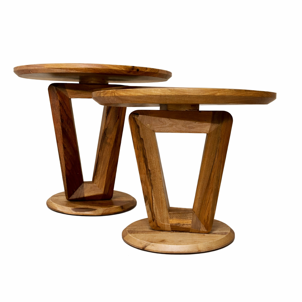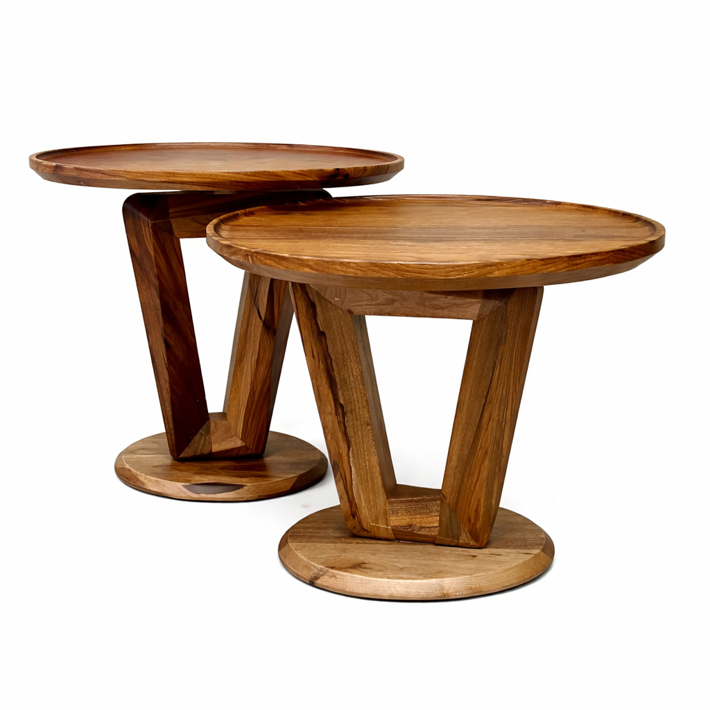 Un conjunto de mesas auxiliares que combina presencia y funcionalidad. Su base geométrica crea una estructura sólida y visualmente liviana, mientras que las tapas circulares con borde suavemente elevado aportan elegancia y practicidad.