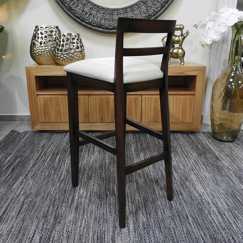 Taburete de diseño clásico y elegante, ideal para comedores o espacios interiores formales. Fabricado en madera, el respaldo esta compuesto por listones horizontales curvados que proporcionan buen soporte y comodidad.